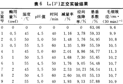 对表6采用综合平衡法,极差大者是主要因素,说明这个因素的水平改变对实验结果影响大。按极差值大小决定的主次顺序为:(1)以减量率为指标酶2%,时间60min,温度5O℃,pH5.5;(2)以降强率为指标酶2%,时间50min,温度55℃,pH5.0;(3)以悬垂系数为指标温度5O℃,时间50min,pH5.5,酶1%;(4)以毛细现象为指标pH5.0,时间50min,酶2%温度45℃。
