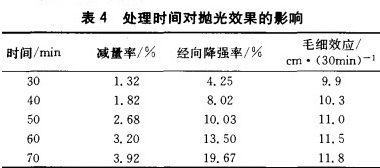 由表4可知,随着时间的延长,棉织物的减量率依次增大,经向降强率也随着增加。这是由于酶在进行催化反应时,首先作用于纤维的表面和无定形区,然后作用于结晶区的边缘,使结晶区不断减小。当处理时间超过50min时,织物的降强率超过10%,对织物损伤过于严重。而反应时间过短,酶作用不充分,表面绒毛去除不净,抛光效果也不佳。综合以上因素,纤维素酶处理的时间宜控制在40~60min。