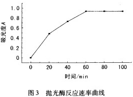 酶与织物之间的作用时间是非常关键的因素。时间过短,抛光处理效果不好;时间过长,织物则有较大的强力损失。将酶促反应中吸光度对时间作图,得到酶反应的速率曲线,见图3。