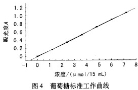 由图4知,当葡萄糖的浓度在0~7.2umol/mL时,葡萄糖的量与吸光度成良好的线性关系,该标准曲线的线性方程为:Y=0.15066x一0.00875,线性相关系数R=0.99984。
