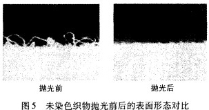由图5可以看出,织物抛光后,表面茸毛明显减少,更加光洁;观察还发现,染色后织物的色泽更加鲜亮,仅有极小色变。根据工厂实际应用情况,为了避免色光的偏差,一般采用先抛光后染色的加工工艺。