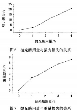 在机械作用程度相同时,抛光酶的用量越高,酶催化水解速率也越高。为了能够使织物的水解控制在一定范围内,需按机械冲击力调节酶的用量。对于厚织物或人造纤维素织物等,采用“分段投料法”更为有效,即先投入1/2用量的酶制剂,在整理进行到一半时再投入另1/2用量的酶制剂』。抛光酶用量过多,会对织物造成过大的强损;用量过少,则不能起到较好的抛光效果。考虑到织物强力损失以及重量损失的因素,在实际应用中,按2.3工艺处方(pH值5.0,温度55℃,抛光反应时间30min),考察酶用量与强力损失和重量损失的关系,见图6和图7。
