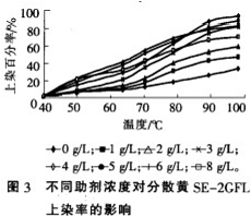 最佳用量任选一支分散染料(分散黄SE一2GFL).通过残液法测定分散染料在不同温度时的上染率.并通过对染料的上染率分析.确定助剂CWL的最佳用量范围分散黄SE一2GFL在常压沸染时不同温度下的上染率如图3所示。