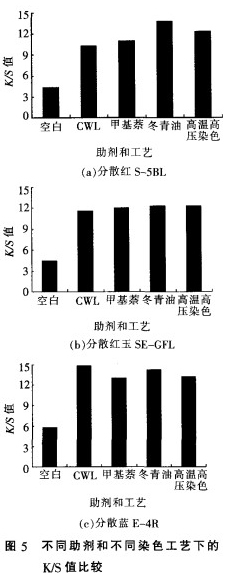 由图5a可知.对于高温分散红S-5BL来说.除了冬青油在常压沸染工艺中的染色深度高于高温高压染色的色深度外,助剂CWL、甲基萘均达不到传统高温染色的色深度:由图5b可知,对于中温分散红玉SE—GFL来说.助剂CWL、甲基萘、冬青油用于常压沸染的染色深度均与高温高压染色的色深度相当:由图5e可知.对于低温分散蓝E一4R来说.助剂CWL具有明显的增深效果.均比甲基萘、冬青油以及高温高压染色的色深度要深因此.助剂CWL比较适用于中温型和低温型分散染料的常压沸染工艺.染色深度完全可以达到高温高压染色的色深度。
