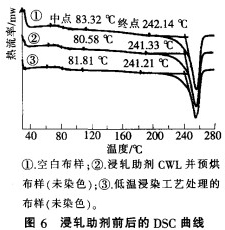 从图6可以看出.经助剂CWL处理后的涤纶纤维的玻璃化温度从83.32℃下降至80.58℃.低温浸染工艺完毕后玻璃化温度成为81.81c(二如果能排除操作误差及环境影响.则可降低得更多.说明助剂确实能够对涤纶纤维产生增塑作用.从而降低涤纶纤维的玻璃图6浸轧助剂前后的DSC曲线化温度.使其成为能够低温染色的一个原因。此外。涤纶纤维的熔点几乎没有改变.说明助剂的添加不降低纤维的熔点。