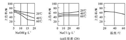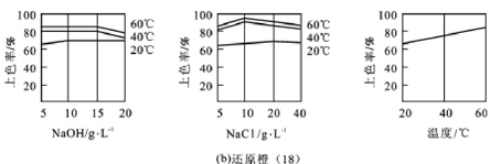 (3)丙法组的还原黄(26)、还原橙(1)和还原红(46)的上色率和碱浓度、盐量和温度的关系如图5-3所示。