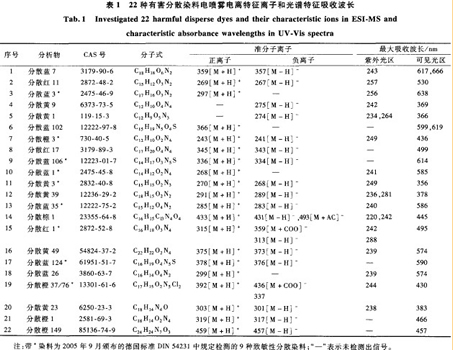 22种分散染料(见表1)有证标准物质均购自德国Dr.Ehrenstorfer公司;甲醇、乙腈(色谱纯,德国Merck公司);乙酸铵(色谱纯,美国Sigma公司)水(由MilliQ系统纯水制备)。
