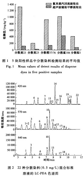 将5块阳性样品(其中2块样品都含有分散黄23)分别用氯苯蒸汽回流法和DIN54231的超声法处理,提取液用LC-PDA定量分析,并对l0次平行测试结果进行统计分析,结果见图1。图中显示,经氯苯蒸汽回流提取后,样品中分散染料的检测值为超声提取结果的2.3~11倍,表明本文方法提取效率更高。此外,本文方法的平行测试结果的相对标准偏差值(RSD)都小于10%,而超声法的RSD值较高,达17.8%~28.4%。这可能是由于在超声容器中超声能量分布不均匀所致,因此,相比较DIN54231规定的超声波辅助甲醇提取方法,本文研究的氯苯蒸汽回流提取方法更稳定,提取效率更高。