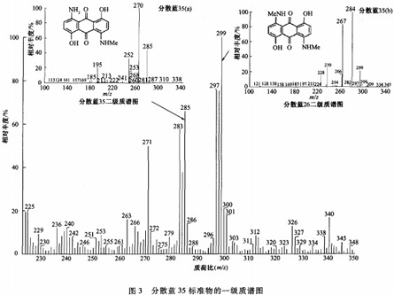 图1中,5块阳性纺织品的10次平行实验结果RSD值都小于10%;向阴性涤纶织品中分别添加5、10、50mg/kg的22种分散染料进行加标回收实验,10次平行实验结果的RSD值都不大于8.4%,回收率都在86.4%~98.7%之间,且加标样品中残留物的SRM特征子离子丰度比与标准物基本一致,满足质谱方法的确证要求。