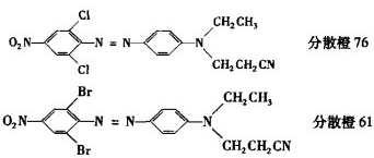 (3)复配型染料中有致敏性分散染料,最负盛名的如分散黑EX2SF300%是由C.I.分散橙76、紫93及蓝291复配而成,因此必须另找复配处方来代替C.I.分散橙76。很多染料厂采用C.I.分散橙61来代替分散橙,两者化学结构相近: