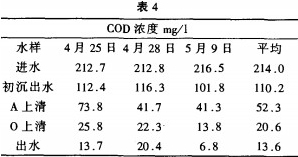 从表4可知,进水COD均值为221.0mg/L,相对于同类性质工厂并不高.经第一次絮凝沉淀后COD均值降为l10.0mg/l,兼氧池除了将大分子水解酸化为小分子以外,也降低了COD,生物接触氧化进一步降低到20.5mg/l,第二次絮凝沉淀除了加强脱落的生物膜与水分离以外,还进一步将COD降低到13.4mg/l,这比排放标准低了92.6%.