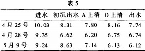 从表5可知:染整加卫产生的废水呈碱性。在废水进入工序前需要调节其PH以达到酸碱度的要求。由于兼性池中兼性菌的水解产酸作用使整体上A池水的PH降低,O池水出现回升现象,但出水PH仍达到6-9的标准。