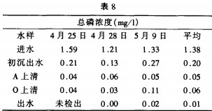 3.4.2结果及分析:由于初沉池中磷酸盐与所加药剂硫酸亚铁反应生成沉淀,且因工艺的除磷作用使出水中已经基本不含磷,去除效率高达99%。