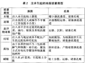注水过程中,由于外来人井流体(注入水)流入油气层,必然要与油气层的岩石和流体接触,将发生各种损害。注水引起的地层损害类型以及各种类型损害的原因和造成的后果各部相同(表2)。