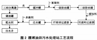 腰滩油田注水井分为东西两片,其中东线注清水,西线前期注清水,2007年底清改污。腰滩油田西线污水处理工艺采用双滤料过滤器+纤维球过滤器的处理方式。设计污水处理流程图如下: