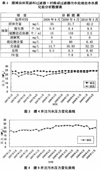腰滩油田西线污水回注工作开始于2007年12月,初期水处理效果较好,但6个月后水质越来越差,多次化验结果显示主要是固含量和含油量超标(表3),已达不到注入水水质指标要求。虽进行了一些更换滤料和反冲洗等维护工作,但由于滤料经常堵塞,导致整个污水处理系统运行成本较高且维护工作量较大。与此同时,注水水质较差使各注水井井口压力升高甚至注不进。其中腰4井改注污水后,从2008年1月至2009年1月油压由20.5Mpa上升至24.5Mpa,压力上涨了4Mpa后于2009年4月注不进(图3)。腰6井注污水后油压由22Mpa上升至28.5Mpa,压力上涨了6Mpa(图4)。