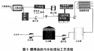 和悬浮物含量几乎为零。通过膜截留后的浓缩液回流至微生物反应池(使有效菌液保留在微生物反应池内)。第三,整个工艺不需再投加絮凝剂和杀菌剂等药剂,使得油藏的水不再因为投加了各种药剂而变得越来越复杂。该工艺处理后污水水质达到低渗油田回注A1级水质标准,可为注水站提供优质稳定的回注水。腰滩油田微生物+膜污水处理工艺流程如图5。