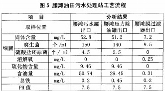 采油厂地质研究所的腰滩油田污水处理水质分析报告数据显示微生物+膜污水处理系统能够较好的净化污水。压力除油器出口含油为29.45mg/L,经过污水系统处理后含油量仅为0.3lmg/L;硫化物含量为9.46mg/L,处理后不含硫化物;硫酸盐还原菌为2.5个/m2,处理后不含硫酸盐还原菌;腐生菌为140个/ml,处理后为9.5个/ml;固体含量51.2mg/L,处理后为7.2mg/L(表5)。该系统能较好的处理含油、硫化物、菌类和固化物等物质。