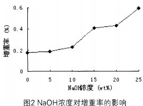 (2)随着NaOH浓度的增加,丝胶蛋白氧化棉纤维的增重率不断增加。