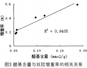 2.3氧化棉纤维的醛基含量与丝胶处理后增重率的关系