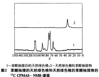 由图1可以看出,天然绿色棉在δ=33处有一个峰,据分析可能是一CHz一基团,认为是天然绿色棉中大量的蜡质和脂肪的结构.将天然绿色棉用苯醇溶液抽提去掉蜡质和脂肪.苯醇抽提过的天然绿色棉和苯醇抽出物进行固体核磁共振波谱分析,见图2.