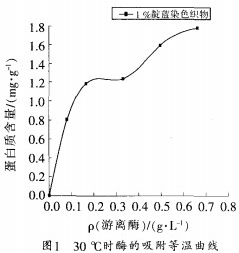 图1是酸性纤维素酶SHL在30℃下的吸附等温曲线由该图可以看出随着体系中游离酶质量浓度的增加.酶在织物上的吸附量增大当游离酶的质量浓度在0.2~0.3g/L时,织物表而酶的吸附量儿乎与游离酶的浓度无关当体系中游离酶的质量浓度超过0.3g/L时.纤维素酶在织物表而的吸附量义开始增加.由此可以认为.纤维素酶在纤维表面的吸附是多分子层吸附。