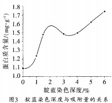 由图3可以看出.靛蓝染色织物上吸附的蛋白含量随着靛蓝染色深度的增大而逐渐增大这表明.纤维素酶与靛蓝之间存在作用力.使得靛蓝染料很容易被纤维素酶吸附俄罗斯学者Gusakov认为.纤维素酶分子吸附区(CBD)上含有的芳香型氨基酸残基对酶与靛蓝之间的吸附起主要作用。而葡萄牙学者Cavaco-PaulO认为].酶分子上的氨基与靛蓝染料上的羰基形成的氢键结合也是纤维素酶和靛蓝能相互吸附的原因。