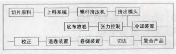 淋膜复合系统主要由上料系统、螺杆挤压机、挤出箱体(模头)、冷却装置、退卷装置、卷绕装置等组成。其主要生产流程如下: