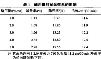 由表1看出,随着酶用量的增加,减量率和经向降强率呈线性增大,毛效也提高明显.而生物抛光整理织物的减量率不宜大于5%,强力损失不宜超过15%,否则会影响织物的服用性能.改善织物性能是纤维素酶处理和织物服用的要求.当酶用量大于3%时,对织物的损伤过于严重.因此,选择酶用量为1%~3%.