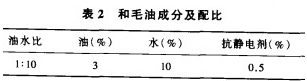 积极调整和毛工艺,选用合理的和毛助剂及混用比例,既要保证可纺性,又要兼顾成纱效果。和毛过程中,先对新型复合纤维进行开松,再进一步与兔羊绒纤维进行混合。由于兔羊绒的吸湿性强、缩绒性好,如果直接加油,兔羊绒易粘并纠缠,应采取间接的给油方式,把和毛油水喷洒在兔羊绒上,闷毛至少24h,使油水均匀渗透,减少梳理时纤维的损伤。兔羊绒的比电阻大、易产生静电,导致可纺性差,因此在和毛油中可加入一定量的抗静电剂;兔绒纤维滑爽,纤维之间抱合力差.因此要加适量的防滑剂(增磨剂),以提高纤维的抱合力,提高可纺性。和毛后的上机回潮率夏季必须控制在20%~24%之间,冬季必须控制在22%一26%之间。兔绒含量越高,和毛油用量越大;抗静电剂的用量也随着兔绒含量的增加而加大,加水量的多少一般要根据原料回潮率、车间相对湿度、上机工艺来确定。和毛油成分及配比见表2。