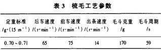 梳毛机是英国TATHAM公司的。由于兔绒光滑,为了避免断网、粗纱大量断头等问题,对梳毛机的速度应适当降低,以后车锡林转速65r/min为佳。为保证梳理效果,梳毛机的工作辊针布选用应尽量细,初梳选用34号针布,末梳选用粗纺最高号35号针布。并在喂毛时均匀添加原料,严格控制喂毛量,回条及时均匀地添加到毛斗内,以保证毛纱支数偏差及不匀率在标准范围内。为避免纤维受到损伤,在纺制高比例纱时,车速不宜太快。兔绒含量高时,车速要适当减慢,为减少机械式喂毛产生的不匀,落毛不匀应采取单位时间里增加喂毛次数,减少喂毛量。适量放大隔距,减少梳理环,由于兔绒轻柔易拉伤,要合理调整各辊隔距,宜大不宜小。梳毛工艺主要参数见表3。