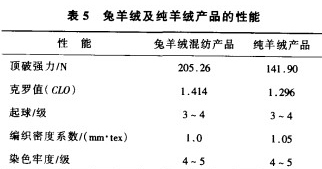 织物的各项性能指标见表5。从表5可见,兔羊绒混纺产品的顶破强度较全羊绒产品的顶破强度大,这主要是使用了新型复合纤维的缘故;兔羊绒混纺产品的克罗值大,这说明该产品的保暖性较好;2种纺织品的起球性和染色牢度相同。