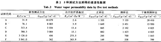 用以上5种方法测试6种试样的透湿性,结果列于表2。正杯法、倒杯法和干燥剂倒杯法给出被测试样每平方米每天的透湿量,而出汗防护热板仪用蒸发阻抗来评价试样的透湿性。新型测试方法不仅给出试样的透湿量,而且用水蒸气扩散阻抗(R)来评定试样的透湿性。可以看出,采用干燥剂倒杯法测得的透湿量最高,其次分别为新型测试方法、倒杯法、正杯法。