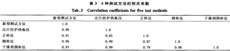 这5种测试方法的相关性见表3。新型测试方法得到的扩散阻抗和用出汗防护热板仪测得的蒸发阻抗一一对应,新型测试方法得到的透湿量与由正杯法、倒杯法及干燥剂倒杯法得到的透湿量一一对应,将由出汗防护热板仪测得的蒸发阻抗的倒数与由正杯法、倒杯法及干燥剂倒杯法得到的透湿量一一对应,分别进行相关性分析。统计分析表明,新型测试方法和出汗防护热板仪、倒杯法及干燥剂倒杯法的相关系数分别为0.99、0.99、0.97,所以,新型测试方法和传统的织物透湿性测试方法存在较高的一致性。除了正杯法外,其他几种测试方法之间的相关性都很好。