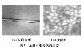 选用1.50dtex×38mm规格的圣麻纤维,其纵向表面有沟槽,横截面呈梅花形和星形,有不规则沟痕(见图1)。由于再生纤维素纤维大分子问氢键较少,且结构呈梅花形,表面有沟痕,由此决定了该纤维具有较好的吸湿、透气性。
