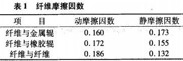 纤维的摩擦性能不仅直接影响产品的外观和手感,与整个纺纱加工的关系也很密切。因为纤维、纱线和织物在加工过程中,会受到充分的摩擦,所以纺织各工序的工艺参数与纤维相互之间和纤维与有关机件之间的摩擦关系很大。试验根据绞盘法测试纺织材料摩擦因数的原理,采用Y151型纤维摩擦因数仪测试纤维与金属辊、纤维与橡胶辊、纤维之间的动摩擦因数及静摩擦因数。测试结果如表l所示。