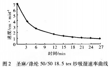 从图2可看出,在0min~20min时,吸湿速率增量从快到慢,20rain以后,吸湿趋于平衡,吸湿速率的增量趋于0。吸湿的瞬间快速性,说明最终产品具有良好的吸湿性能。