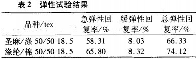 为进一步了解圣麻涤纶混纺纱的物理机械性能,选用了同规格的涤棉混纺纱进行对比,并用Y391型纱线弹性仪对其进行了测试,研究圣麻涤纶混纺纱的弹性。测试结果见表2。