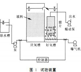 试验装置如图1所示。模拟印染废水从原水槽经泵提升后由厌氧槽底部进入系统,厌氧槽出水溢流到好氧槽,废水经膜过滤后,由蠕动泵抽吸出水。厌氧槽的有效容积为9L,其内装填有5cm的聚丙烯球形填料,出水为溢流出水;好氧槽为一体式膜生物反应器,内置有机平板膜,尺寸为0.303mm,0.212m,有效膜面积为0.1285m2,膜孔径为0.1~0.4Lm,采用微孔曝气,错流过滤;好氧槽与厌氧槽的HRT均为24h,MLSS控制在3.0~4.5g/L,温度为20~32℃。由时间继电器、电磁开关和液位控制器等元件构成自控系统,控制和调节系统的进水、出水、曝气等操作。