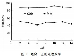 在染料浓度为50mg/L时,组合工艺对COD和色度的去除率如图2所示。