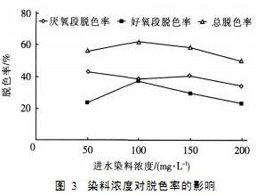 从图3可以看出,系统对活性艳蓝KN-R的脱色率随进水染料浓度的增大而先升高后下降,当进水染料浓度为100mg/L时,脱色率最高(为62%)。在厌氧过程中,脱色率随进水染料浓度的升高而下降,这可能与染料浓度升高导致其生物毒性作用增大有关。试验中还发现,厌氧段对COD的去除率随染料浓度的升高而下降,这也是受染料毒性的影响;系统对COD的总去除率基本维持在90%左右。