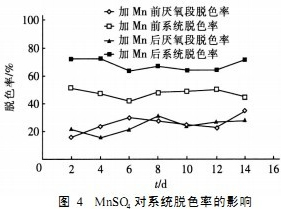 添加微量元素Mn可以提高锰过氧化氢酶(MnP)的活性,从而提高微生物的脱色率,向进水中添加7.5mg/L的MnSO4作为增加进水中微量元素Mn的手段,考察了对脱色效果的影响,结果见图4。