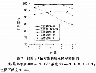 五种染液初始pH值为碱性(采用稀氢氧化钠调节)时,加入Fenton试剂,染液颜色基本无变化,脱色率在2%以下;当染液初始pH值为酸性或弱酸性时,pH值对染料废水降解的影响如图2所示。