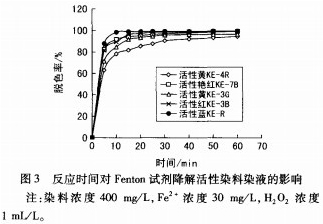 图3表明,Fenton试剂对活性染料的降解非常快,反应开始5rain时,脱色率就已达到了63%以上;反应至15min,脱色率均已达80%以上,特别是活性蓝KE—R的脱色率已经接近100%,颜色完全退去;反应30min后,脱色率均达90%以上。60min基本反应完全。由此可以看出,在反应开始15min内,降解效率最高,Fenton试剂的作用效果非常理想。