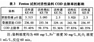 Fenton试剂对活性染料染液COD的去除率如表3所示。