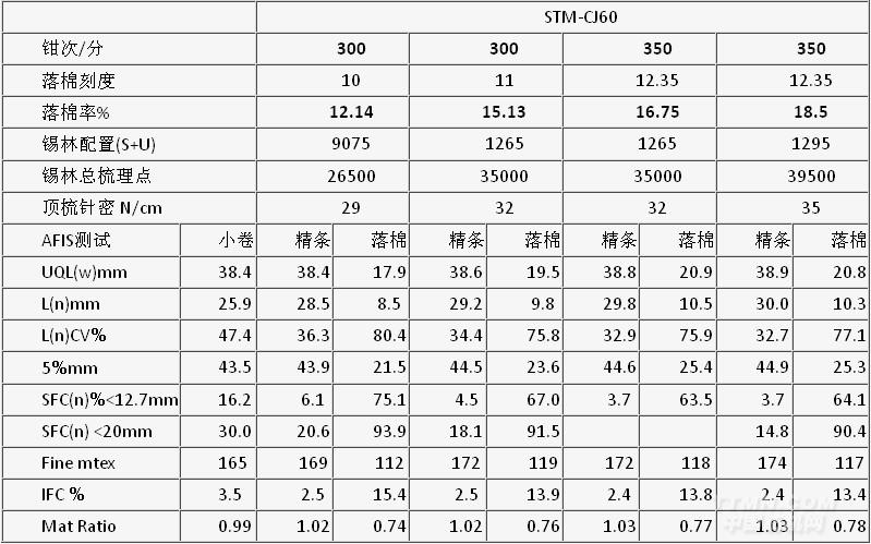 CJ60精梳机 100%新疆长绒棉不同落棉率 AFIS测试