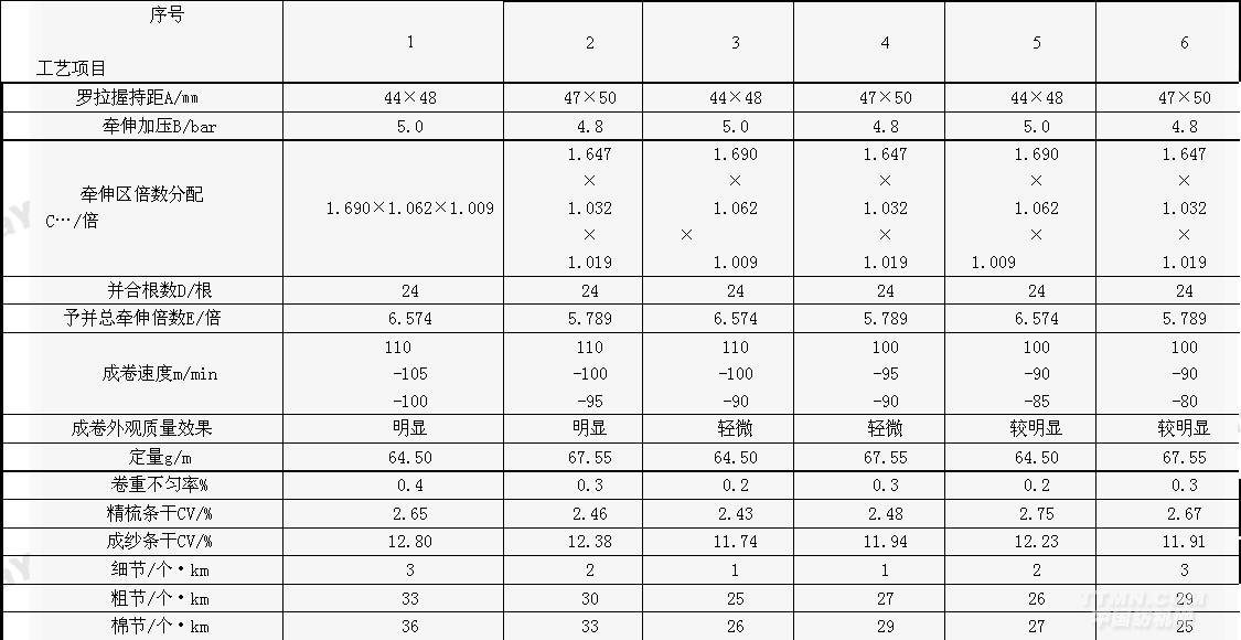 生产中在对成卷质量有较大影响的工艺参数,如牵伸区倍数的分配、罗拉握持距、加压力度等各项因素做了对比试验,其成卷质量效果见表(1)