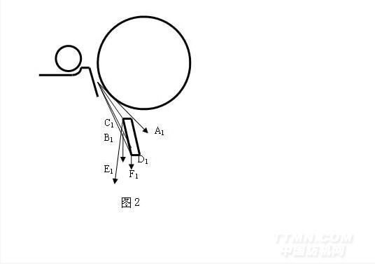 2、锡林道夫三角区(关联部位:大漏底进口、前罩板进出口、前固定盖板隔距、道夫低压吸尘罩吸风量、前棉网清洁器吸风量等),此处气流是否畅通关系到纤维能否顺利凝聚,影响生条中纤维的伸直度和棉网结构。此处气流不畅,容易造成道夫凝聚不良,前车肚落棉网、棉网云斑、大漏底挂花等不良现象。