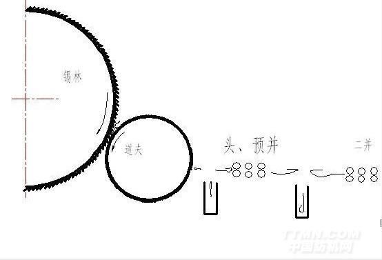 (1)牵伸工艺不符合纤维弯钩伸直的理论。梳棉机锡林道夫间为分梳配置。锡林表面速度远远大于道夫表面速度。纤维从锡林转移到道夫上时,道夫针齿往往抓住扬起在锡林针面的纤维尾端,其前端,则受锡林针齿梳理而伸直。前端伸直,尾部被道夫针齿握持的纤维,被剥棉罗拉剥下后,在棉条中便成为后弯钩纤维(约占50%左右)。这种后弯钩纤维圈入条筒再引出喂入头、预并时,便成为前弯钩纤维。前弯钩纤维圈入条筒再引出喂入二并时,便成了后弯钩纤维。其余以此类推。如图1所示。所以,喂入头、预并的是以前弯钩纤维居多的生条,而喂入二并的是以后弯钩纤维居多的半熟条。