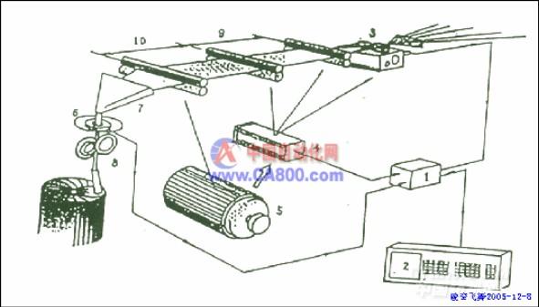 该自调匀整系统是开环控制系统,图中喂人纱条的粗细由凹凸罗拉3检测,纱条粗细的变化通过高精度的位移传感器将位移变化量转变为电信号,输入模块1,在计算机中与标准值(设定值)比较,然后计算出差值,并存储下来,当被检测的纱条到达变速点时,模块1发出信号,使伺服电机5的转速发生变化,从而改变二罗拉的转速,进而改变主牵伸区10的牵伸倍数,修正喂入纱条的偏差,使输出纱条达到均匀的目的。